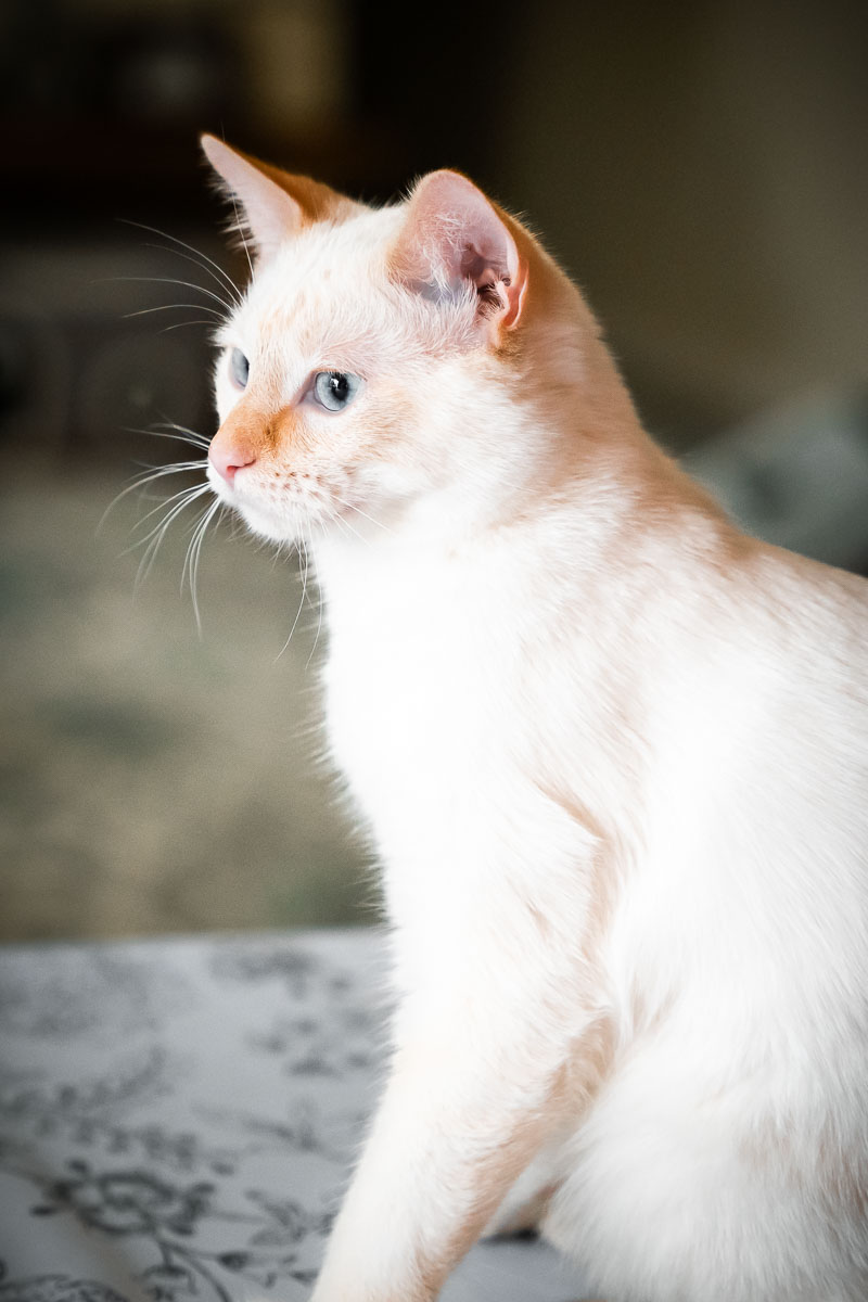 According to Google AI: “Orange Tabbies or Gingers are Domestic short hair cats and a Flame point or Red point Siamese is a cross breed of Ginger and Siamese, rare—because the ginger chromosome for the coat color is 75% male. They have a delightful demeanor and have the best of both breeds.” His beautiful blue eyes are from the Siamese mix in him. My other daughter recently rescued a Siamese mix that I posted about here.